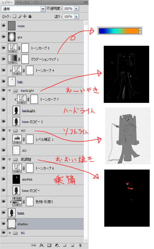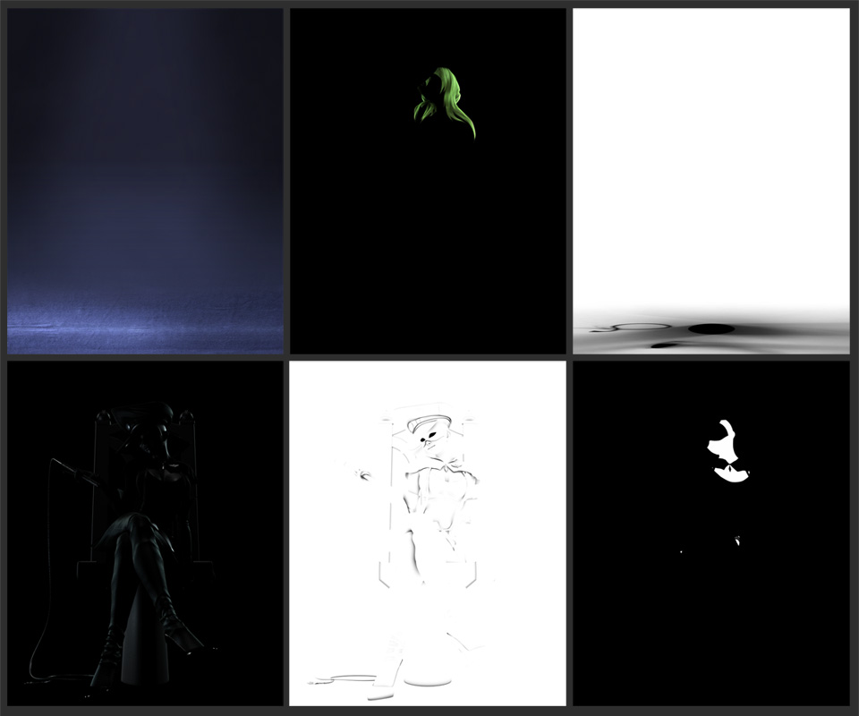あとは、フォトショで作ったBGと、床用の影と、別出ししたバックライトと、AOと、肌の色調整用マスクっと